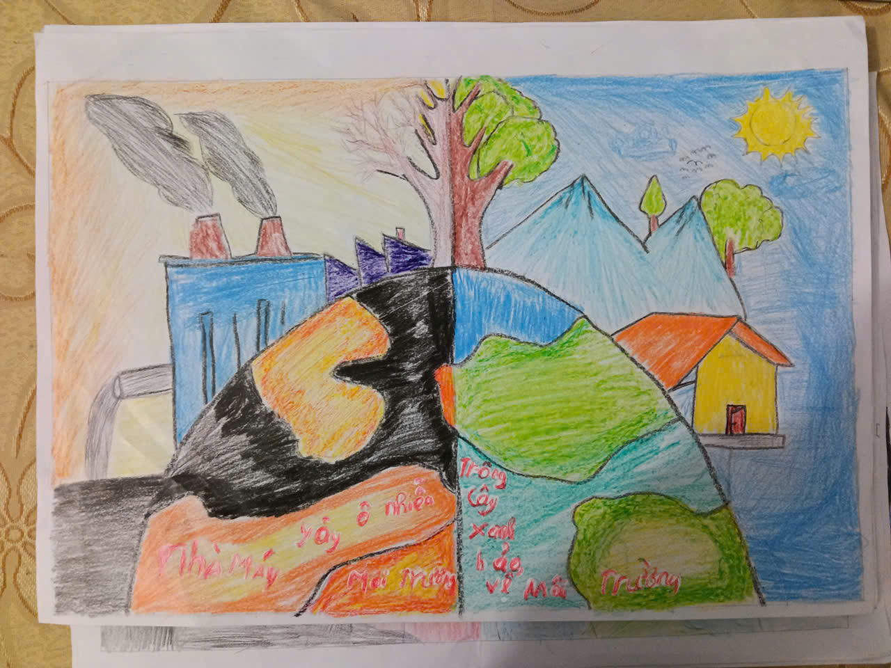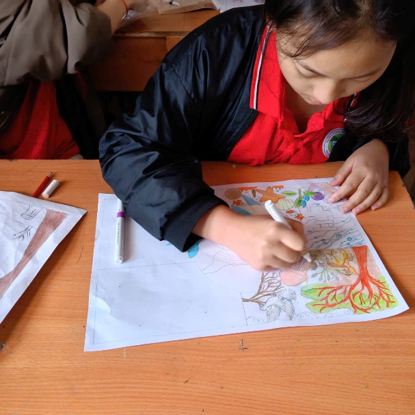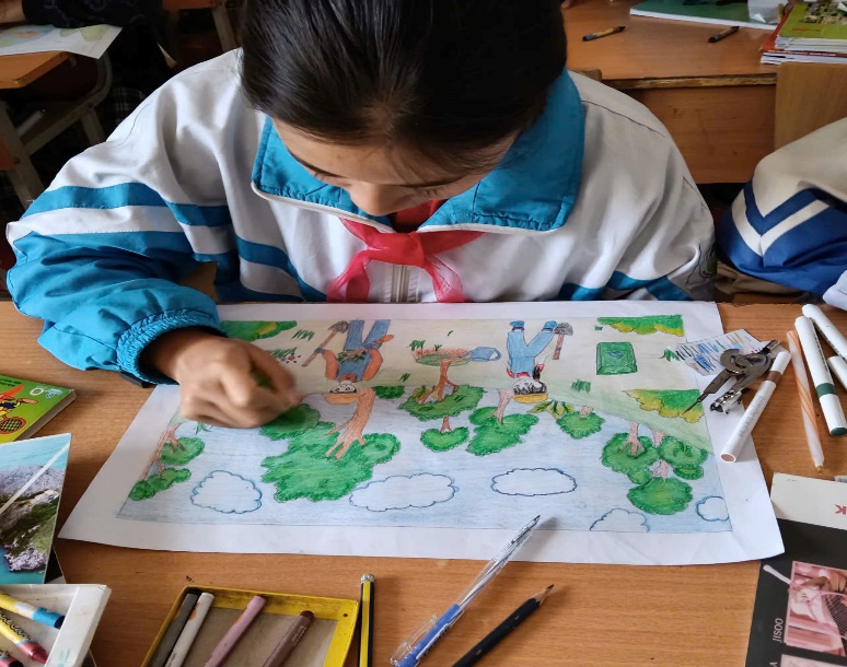 Tại các lớp học của trường PTDTBT THCS Hừa Ngài, không khí trở nên sôi nổi khi các em bắt tay vào thực hiện các tác phẩm trên khổ giấy A3 (29cm x 40cm). Bằng những chất liệu đa dạng như bút chì, sáp màu, màu nước hay thậm chí là tranh dán giấy, mỗi bức tranh là một câu chuyện riêng về tình yêu thiên nhiên.